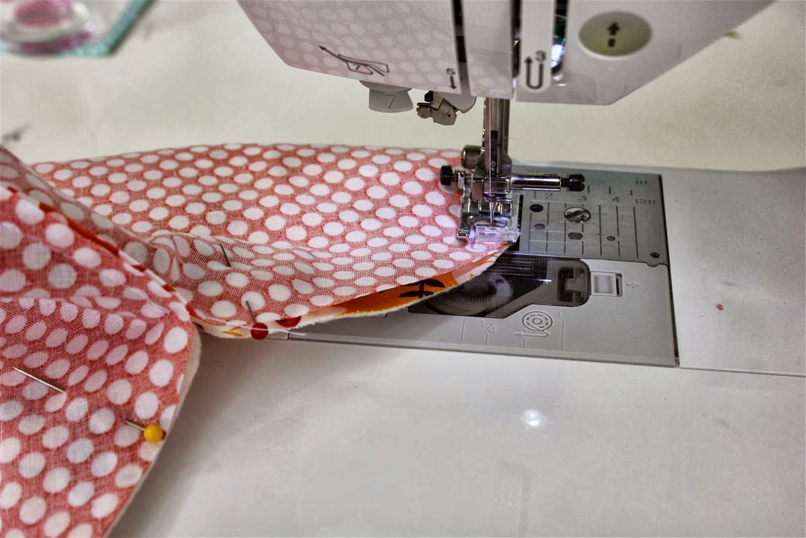2. Depois de fazer as marcas em todos os tecido, para depois nos ajudar a colocar no sítio correcto, vamos costurar o tecido de enchimento no tecido exterior. Para coser, convém usar o calcador 1/4 de polegada.